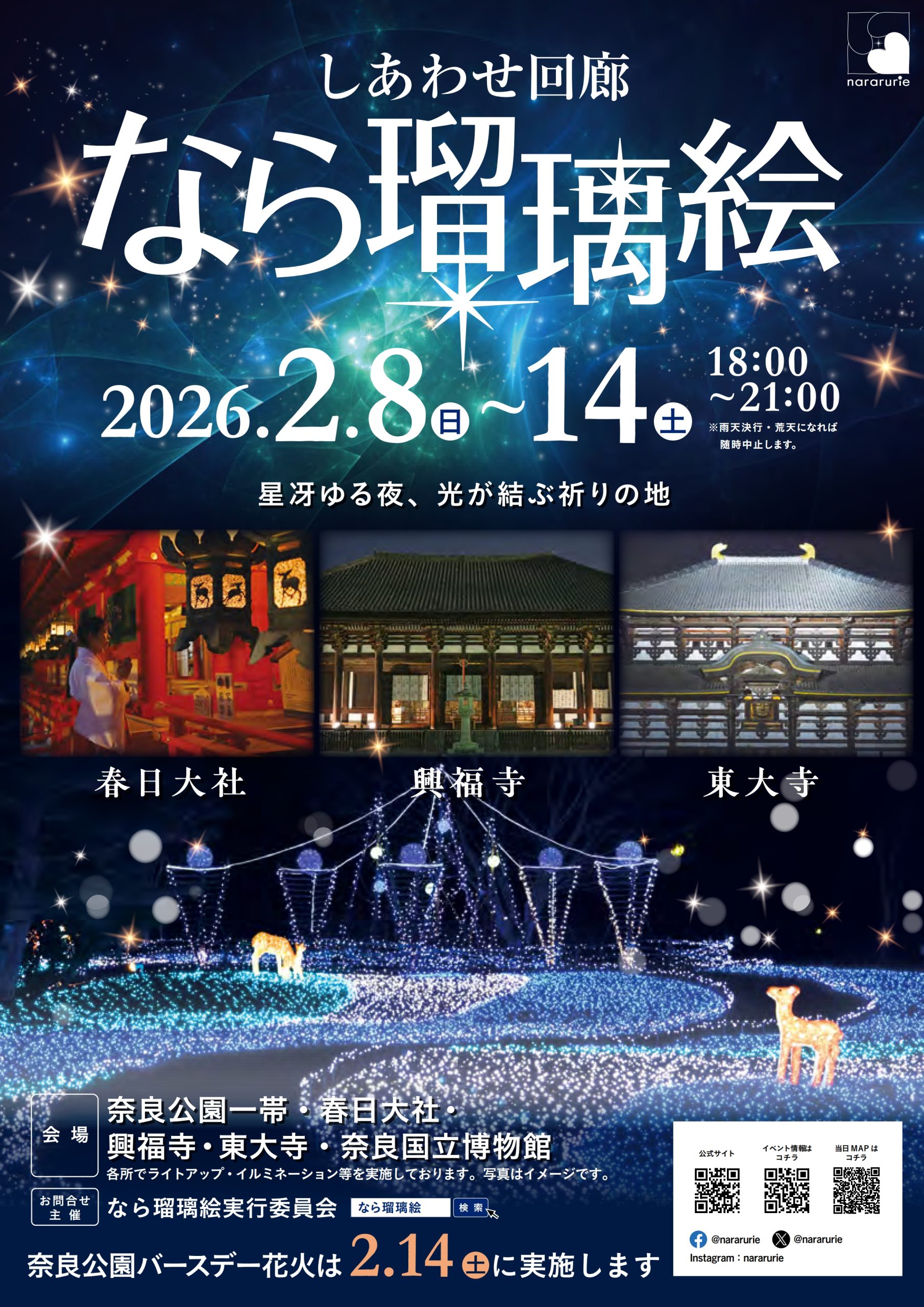 なら瑠璃絵最終日のバレンタインデーは、奈良公園の145回目のバースデー。奈良公園のお誕生日をみんなでお祝いしましょう。見上げれば夜空に打ち上る花火。地上は一面星屑を散りばめたかのよう。冬の素敵な思い出は、あなたと大切な人の絆をいっそう深めてくれるはずです。