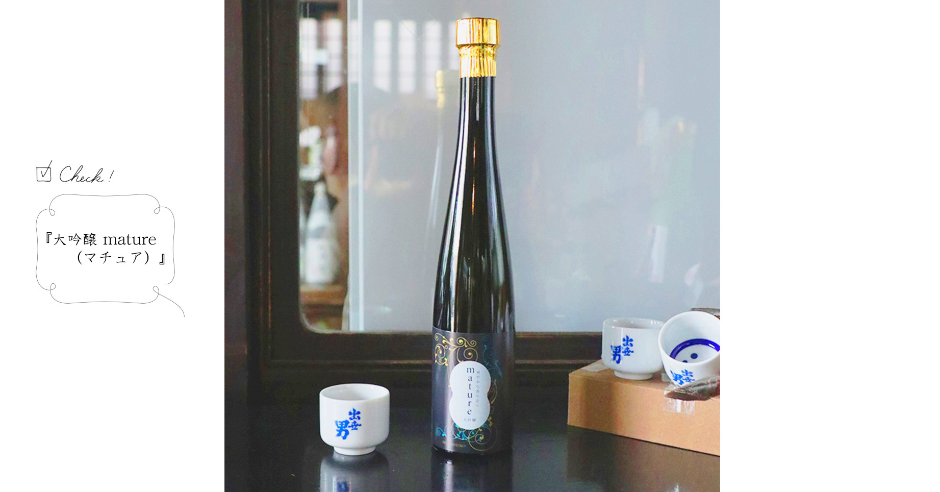 2本目は『大吟醸 mature(マチュア)』。洋酒ボトルのようなスタイリッシュなフォルムが目をひくこのお酒。英語で「成熟」や「満ちる」などの意味を持つ“mature”と名付けられ、近年の女子会ブームをきっかけに開発されました。