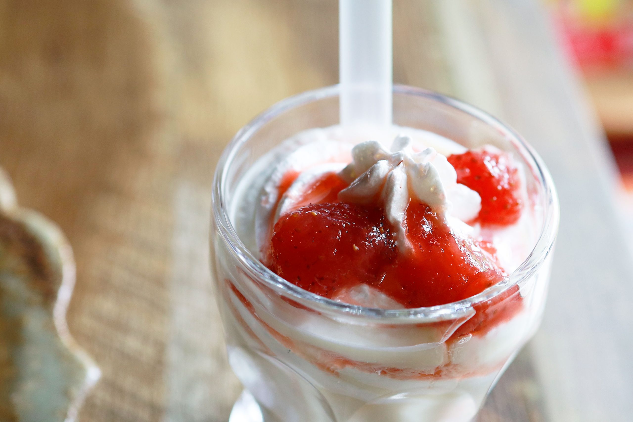 さて、次は「アスカルビーのソイグルト」をいただきましょう。ヨーグルトと豆乳の優しい甘みに、甘酸っぱいアスカルビーのジャムがトッピング。甘みと酸味が合わさって、まろやかな風味! 太めのストローから、ちゅるんっとイチゴが口に入ってくる瞬間は、もう言葉にならないおいしさです。