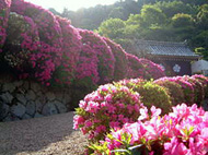 風の森峠の北、国道24号から東、高野街道沿いの高台にある古刹。奈良時代の神亀(じんき)年間に行基が創建したと伝えられ、本尊に薬師如来を祀る。山号の医王山も、薬師如来が心身の病を癒すことに由来する。ここ船宿寺は花の寺として知られ、春には1千株のヒラドツツジ、キリシマツツジ、サツキなどが咲き誇り、またアジサイや紅葉など、四季折々の自然の美を堪能できる。大和にはあまり見られない裏山を借景にした池泉回遊式の庭園も見どころ。本堂前の広場から見る西方に葛城山、金剛山の眺めも美しい。 |