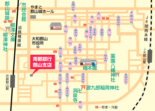 南都銀行郡山支店は、近鉄郡山駅の東側へ徒歩約1分、賑やかで昔懐かしさ漂う駅前商店街のなかにあります。