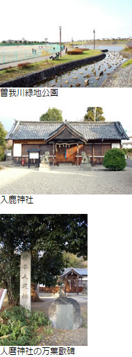 また公園の高いところからは、堤の向こうに曽我川を望むことができます。 「真菅よし 宗我(そが)の河原に鳴く千鳥 間無しわが背子 わが戀(こ)ふらくは」(巻12-3087)。 恋焦がれる恋人への思いを、曽我川の川原で鳴く千鳥に託した柿本人麻呂の歌で、「真菅よし」は「そが」に掛かる枕詞です。現在の橿原市曽我町は、旧真菅(ますげ)村の村域に入りますが、いまも真菅(ますが)駅や真菅(ますげ)小学校など、同じ字で読み方の異なる名称が並存しています。この枕詞の読みにも、「ますがよし」「ますげよし」の2つの説があります。地名や名称の中に、いまも万葉の世界が生きているとは、なんともロマンチックです。
