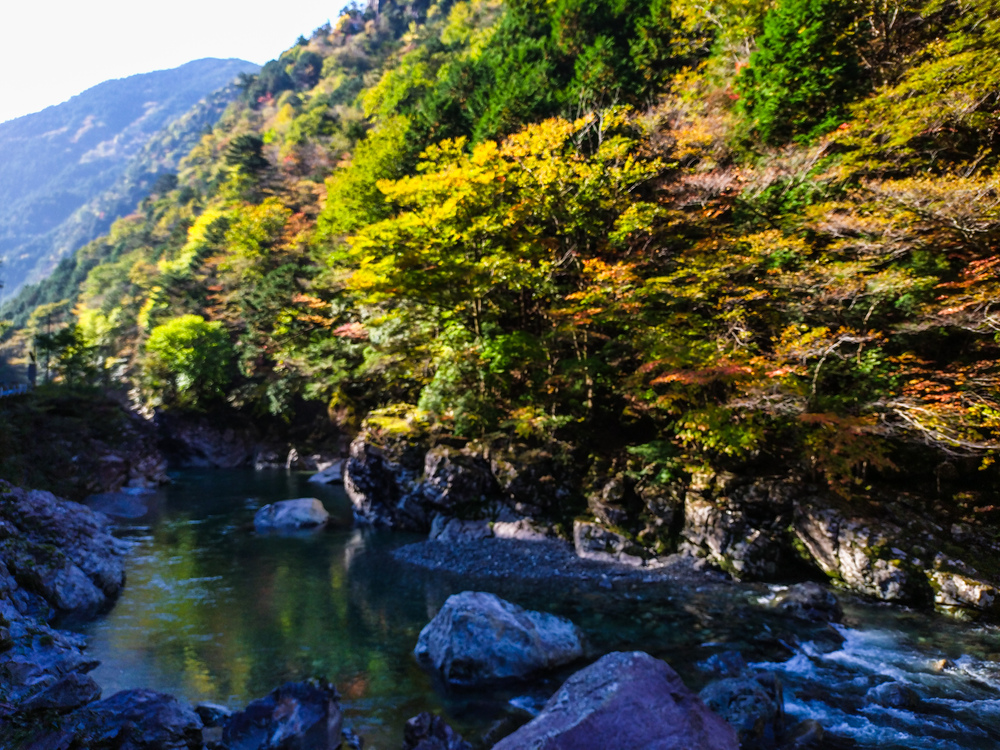巨岩と滝、清らかな水流が織り成す奈良県屈指の景勝地。遊歩道の吊り橋から、エメラルドグリーンに輝く川や、みたらいの滝、光の滝などの大小さまざまな滝と、色鮮やかな紅葉との競演が楽しめます。イロハモミジやオオモミジ、カエデなどが山頂から色づき始め、やがて壮大な渓谷美を描き出します。