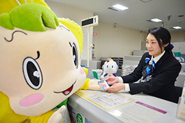 三宅町のおとなり、川西町にある川西支店にお邪魔したよ。川西町と三宅町は同じ磯城郡の町!行員さんもみやっぴぃのことをよく知ってくれてるんだ♪嬉しいな♪