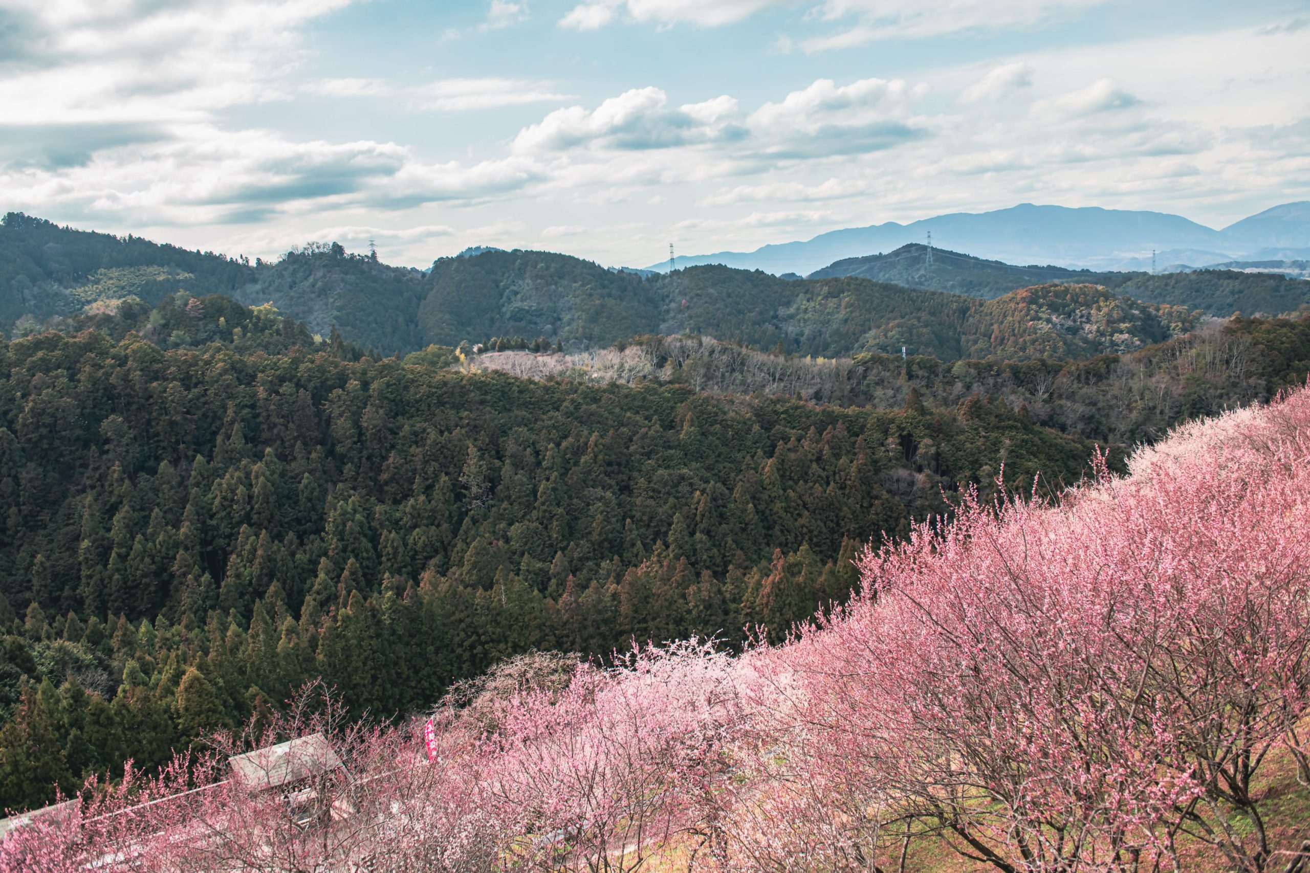 広橋峠の北側斜面、約25ヘクタールにわたって約5,000本の梅が植栽される名勝です。標高が高く見晴らしは抜群。見頃は2月下旬から3月下旬で、白梅、紅梅、淡桃色など色とりどりの梅が甘い香りを漂わせます。散策道が整備されており、展望デッキからの景色を楽しめる他、早春のハイキングにもおすすめです。